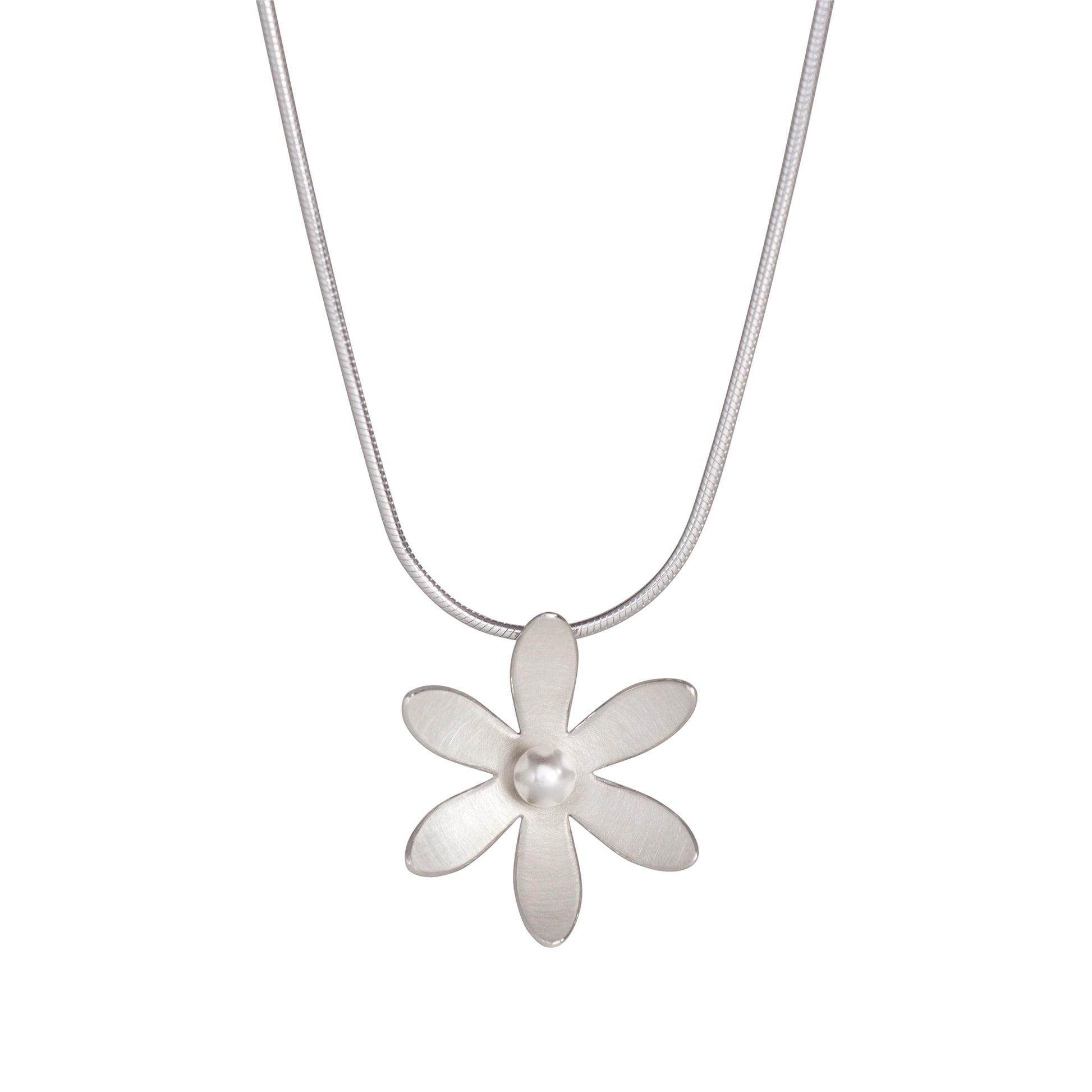 This pretty handmade sterling silver daisy flower necklace has a brushed satin finish with contrasting polished edges and has the beautiful addition of white crystal pearl.