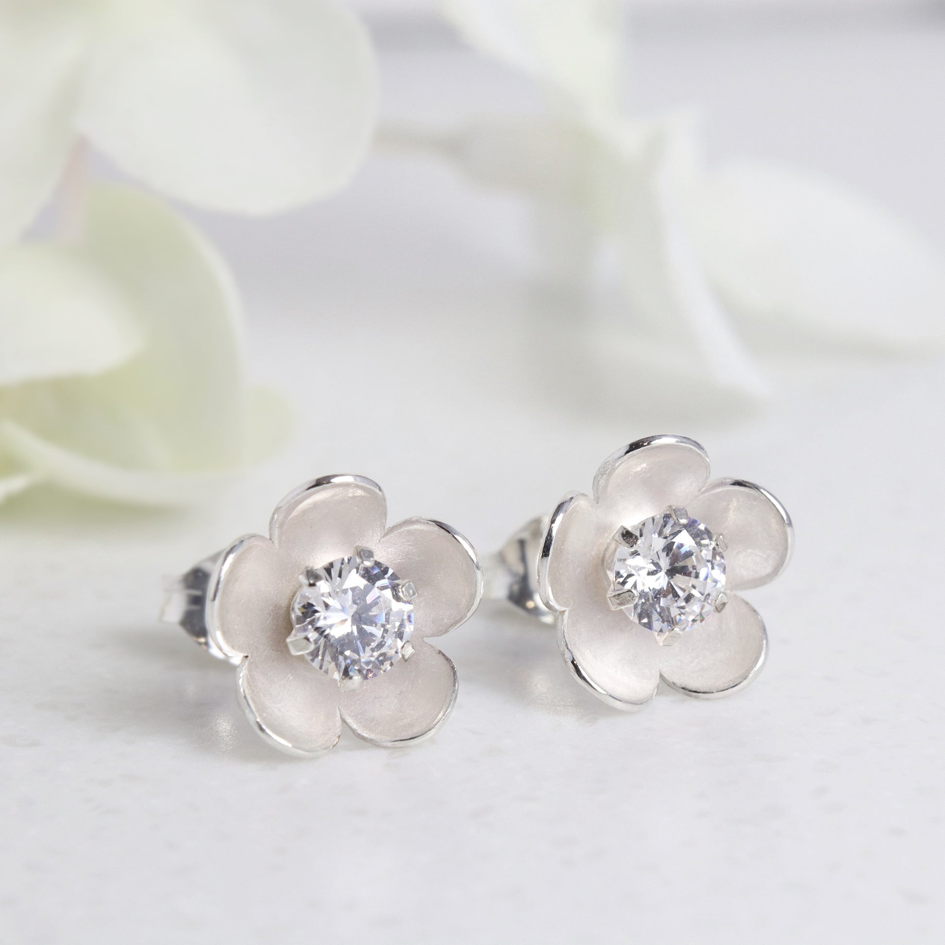 Pretty and delicate silver flower stud earrings, perfect birthday or anniversary presents.