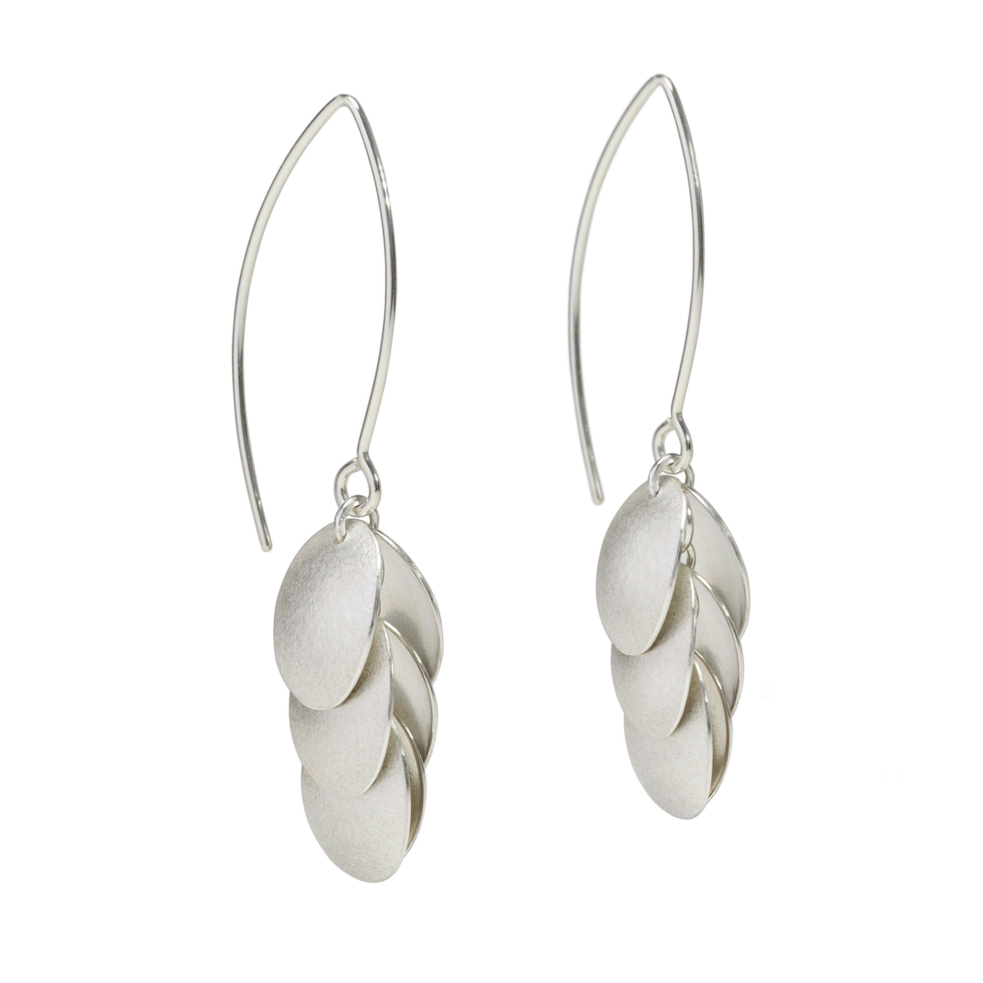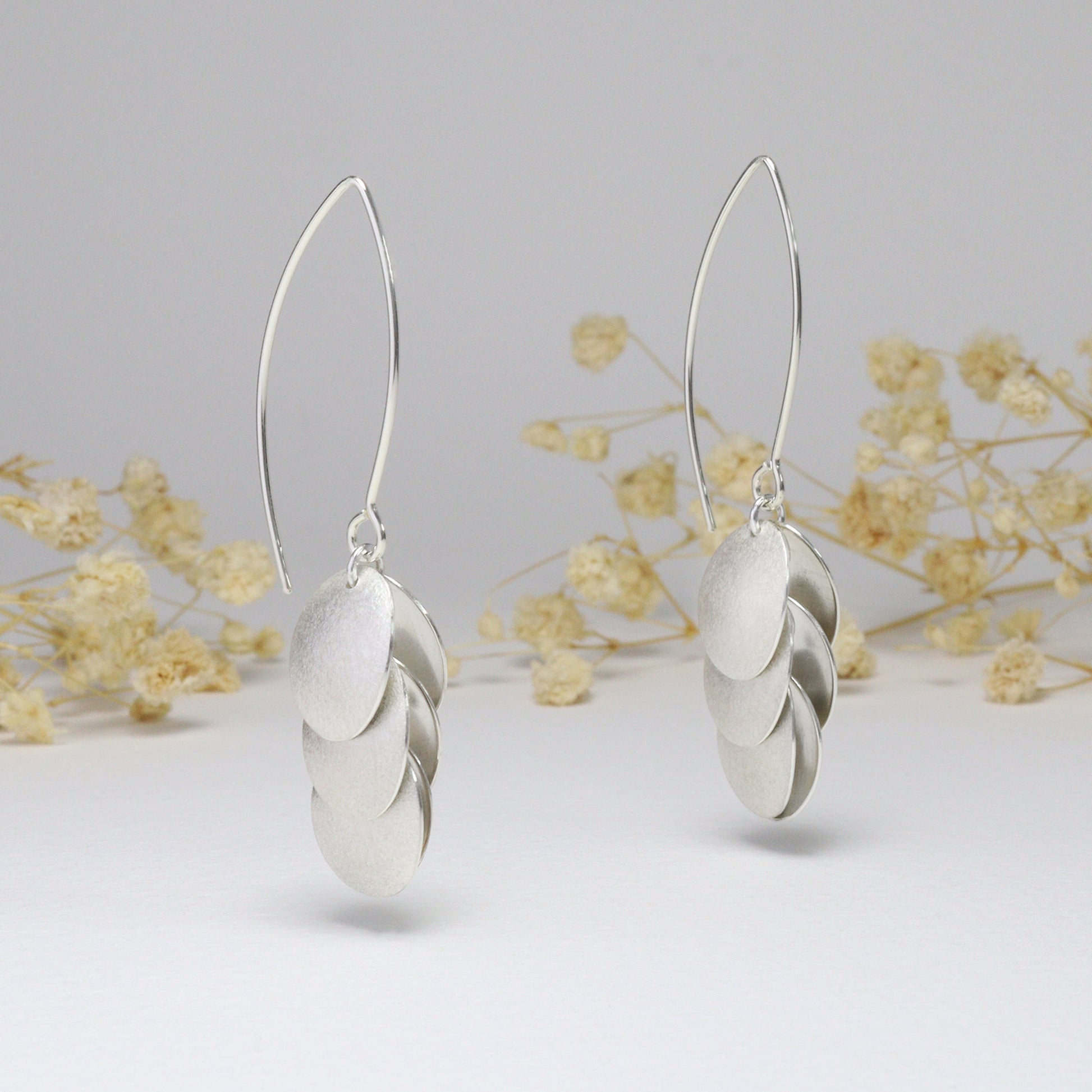 Overlapping silver petals, with lovely movement on long earring wires. Handmade from sterling Ecosilver with a lovely contemporary textured matt finish with polished edges.