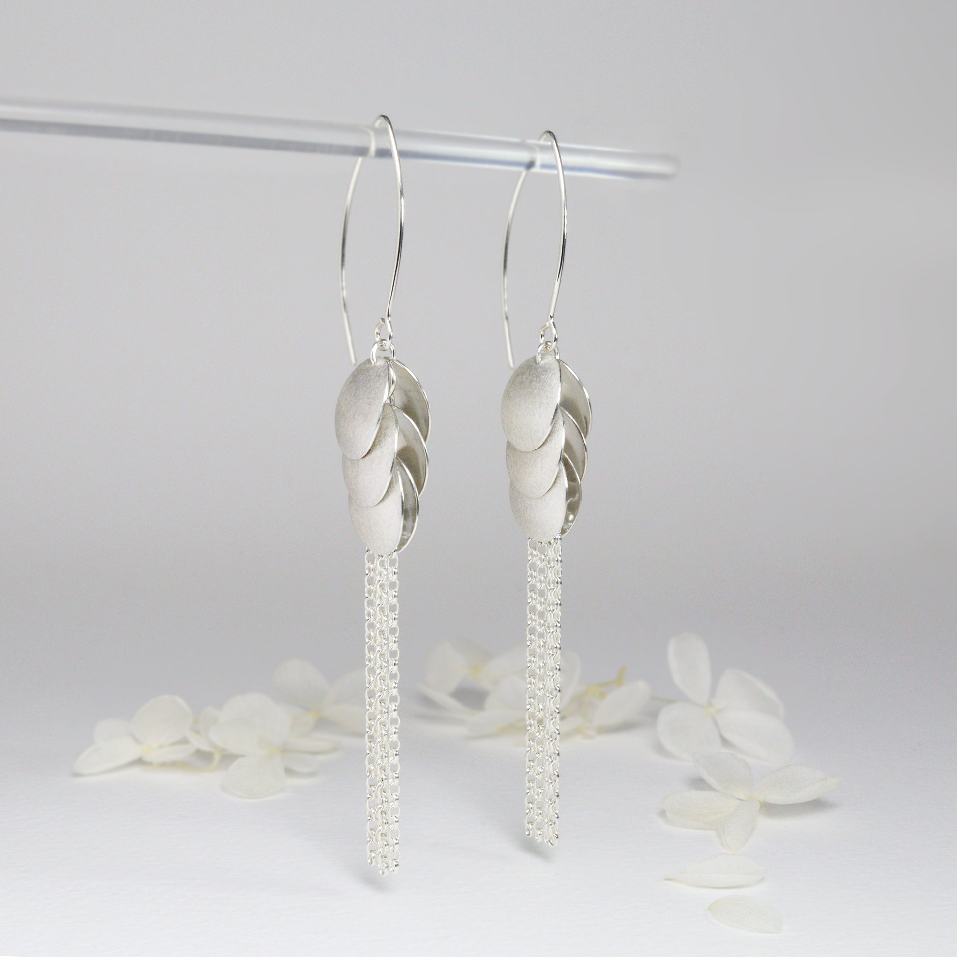 Dramatic earrings with overlapping silver petals and long silver chain tassels, on long earring wires. These handmade earrings are made from recycled sterling silver. They have a lovely movement to them with a soft contemporary textured matt finish highlighted by polished edges.